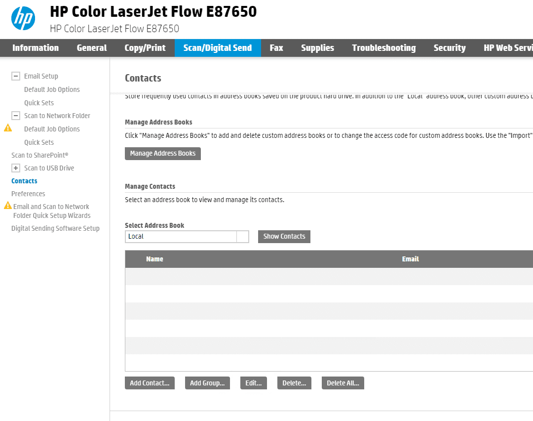 3. Click the “Scan/Digital Send” tab at the top and then, in the left column, click “Contacts”. Scroll to the bottom of the screen and under “Manage Contacts” the local address book should be selected. Click “Add Contact” to add a new user or select the existing user and click “Delete” to remove them.