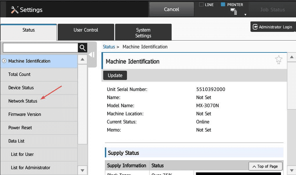 1. You will need the IP address of the copier, to get this go to the machine and press the “Settings” button and then “Network Status”.