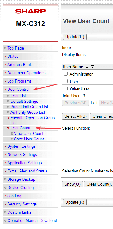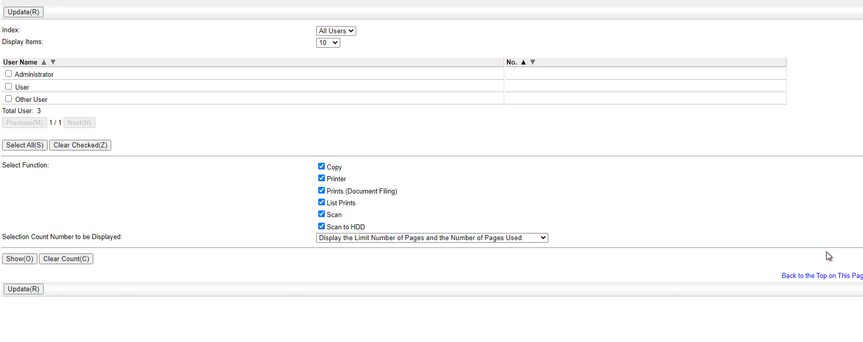 5. From here you can check and clear counters for all or specific users. Check the box next to the user and then at the bottom choose either “Show” or “Clear Counter”. Once you are finished you can close the webpage.