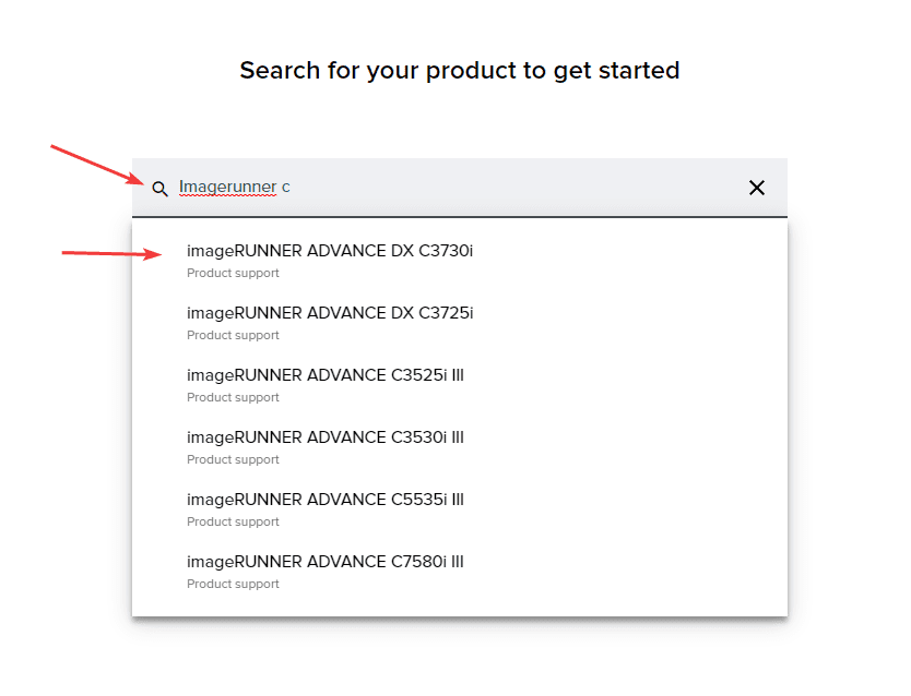 1. Navigate to the Canon support page, search for your printer model in the search bar and select it from the list of results.