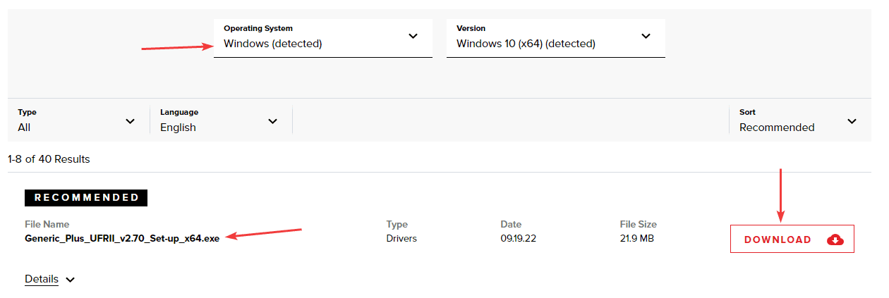 2. Make sure the correct OS is selected and then find and download the “Generic_Plus_UFRII…” driver.