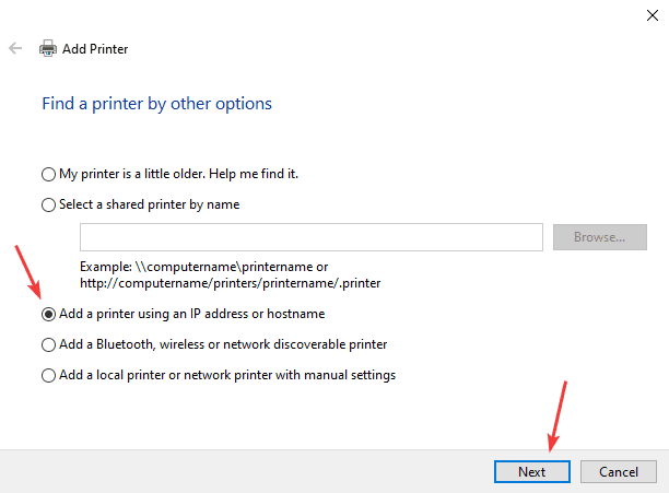 9. Select “Add a printer using an IP address or hostname” and then click “Next”.