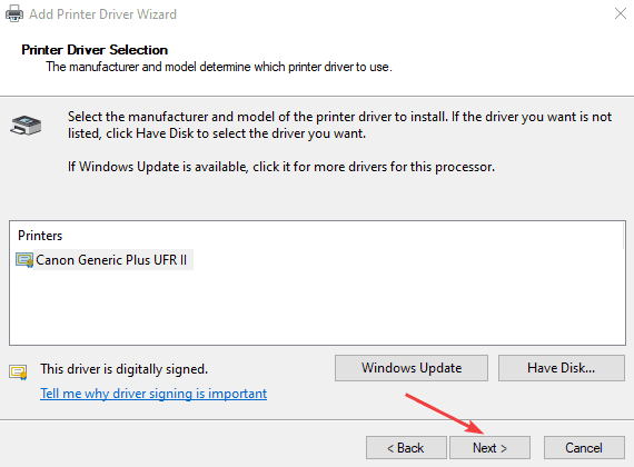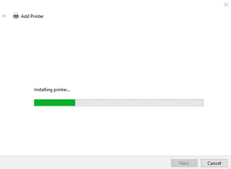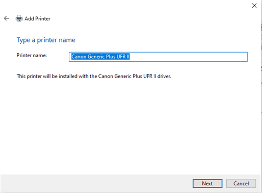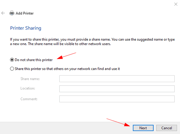 19. On Windows 10 you will get a sharing screen. Click “Do not share this printer” and click “Next”.