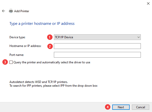 16. Drop down the “Device type” to “TCP/IP Device”. Type the IP address of the copier in the “Hostname or IP address” field. Leave the “Port name” field with whatever is populated there, uncheck the box at the bottom, then click “Next”.