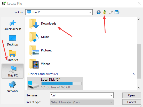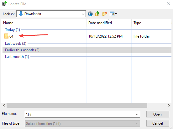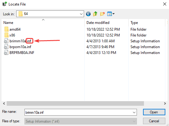 20. Find the folder that was extracted earlier, open it and select the first .inf file in the list and then click “Open”.