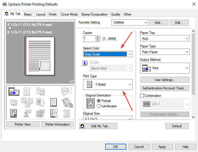 6. From here you can select the defaults you want to set, such as two or one-sided printing and color or black and white. Once finished, click the “OK” button at the bottom, then “OK” on the Printer properties window and you are now finished.