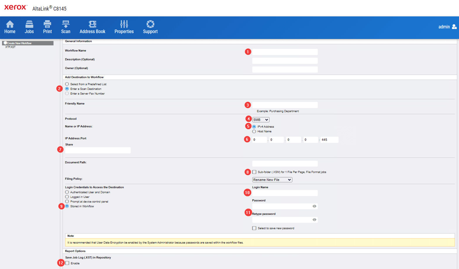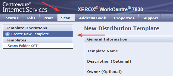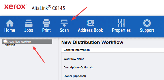 13. After signing in, press the “Scan” tab at the top of the screen and then click “Create new Workflow” or “Create new template” depending on your copier version.