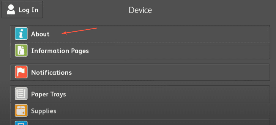 10. Go to the physical copier and press the “Machine Status” button and then, under the “Machine Information” tab, find the IP address. On some models, you will have a “Device” button on the main screen and then “About” and the IP is at the bottom.