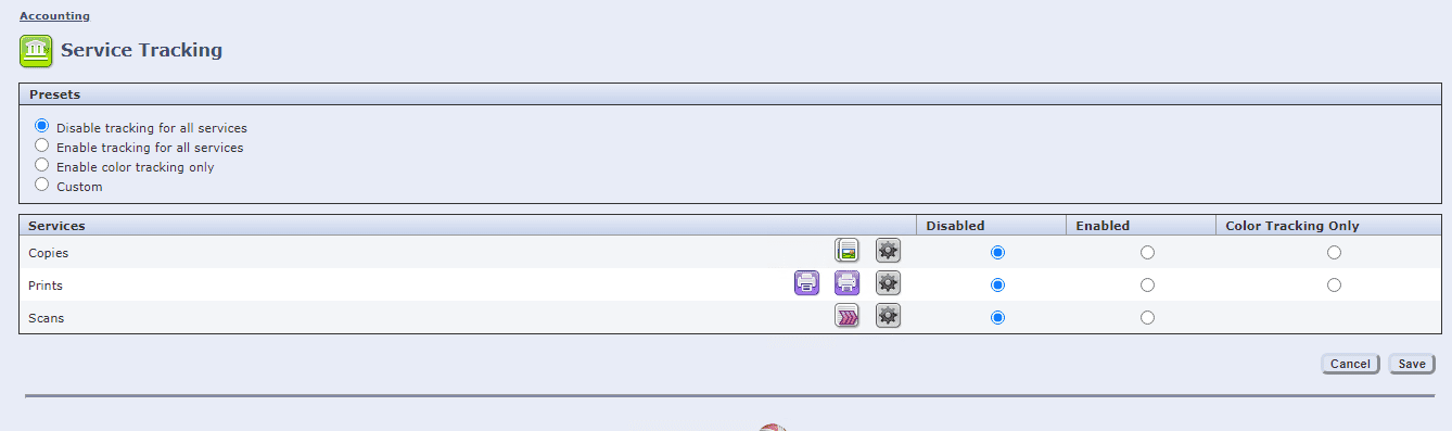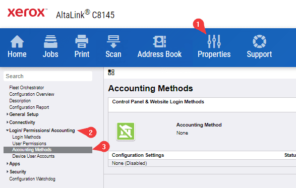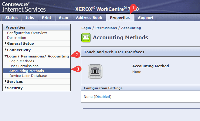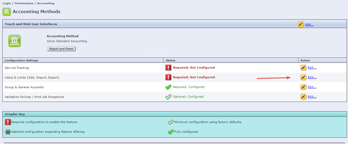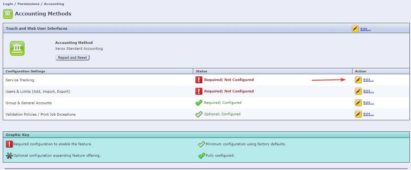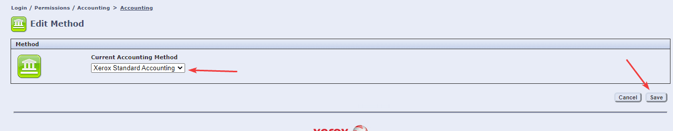 5. Click the “Edit” option and then, under “Current Accounting Method”, click the drop-down and select “Xerox Standard Accounting” and click “Save”.