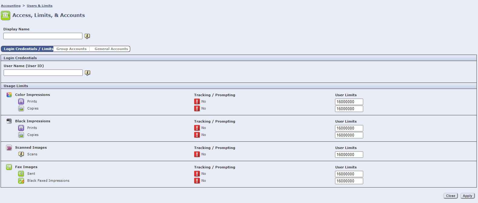 10. Fill out the “Display Name” and then type in the “User ID”, which can be either letters or numbers. The User ID is what the person will type on the machine to gain access. If you want to limit the number of copies and prints, you can type in a number or just leave the default. When you’re finished, you can click “Apply” at the bottom.