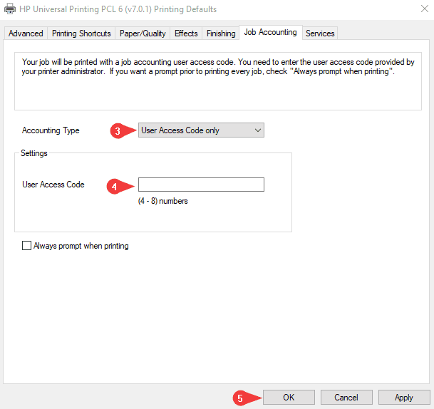 6. Next, go to the “Advanced” tab and click “Printing Defaults” at the bottom. In the window that pops up, go to the “Job Accounting” tab and click the “Accounting Type” to User Access”, type in your code and then click “OK”.