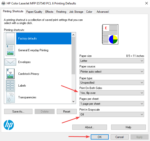 6. From here you can select the defaults you want to set, such as two or one-sided printing and color or black and white. Once finished, click the “OK” button at the bottom, then “OK” on the Printer properties window and you are now finished.