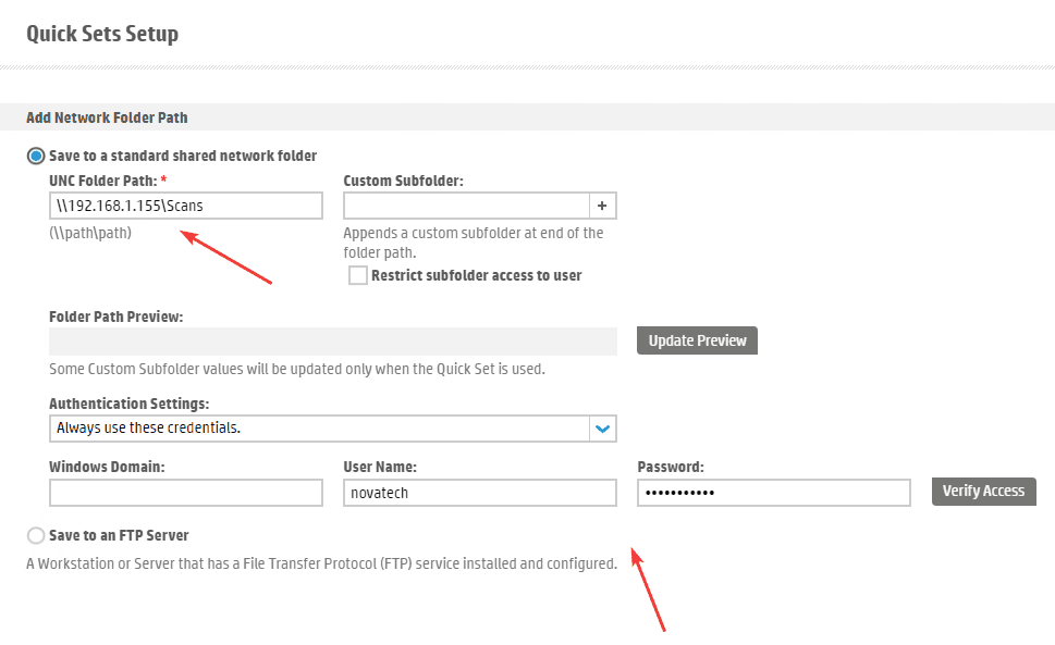 13. For the “UNC Folder Path” type “\\yourcomputeripaddress\Scans”. Drop the “Authentication Settings” down to “Always use these credentials” and then type in your username and password for the computer, then click “OK”.