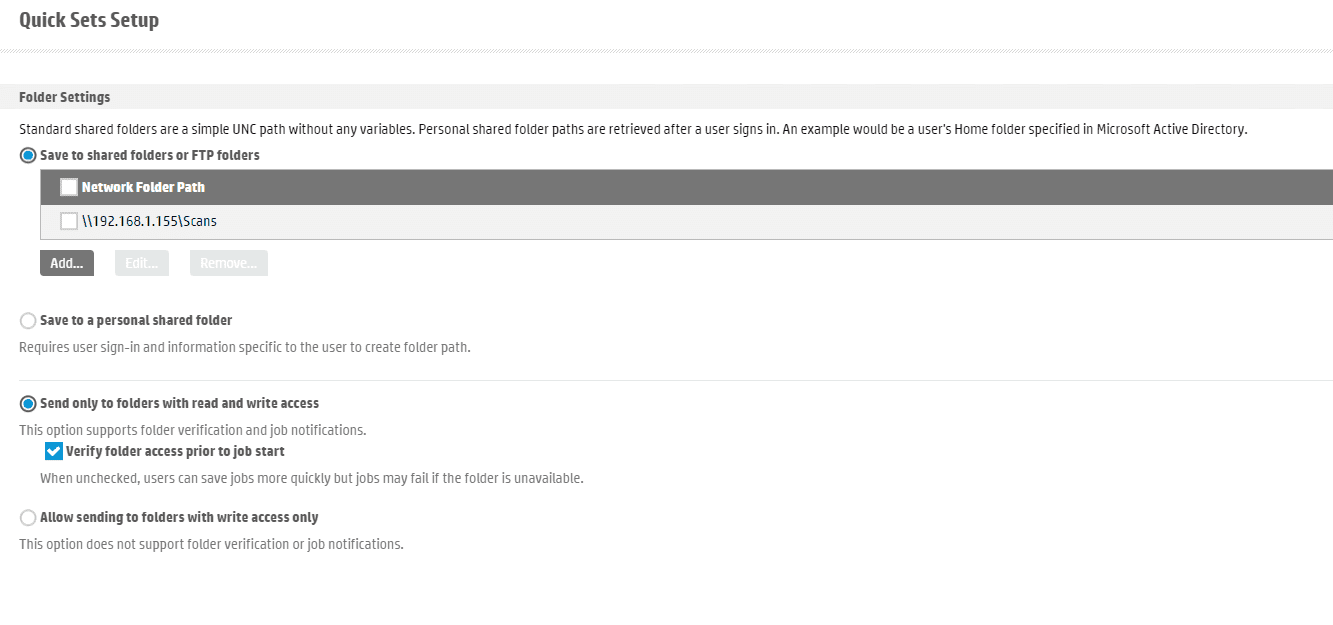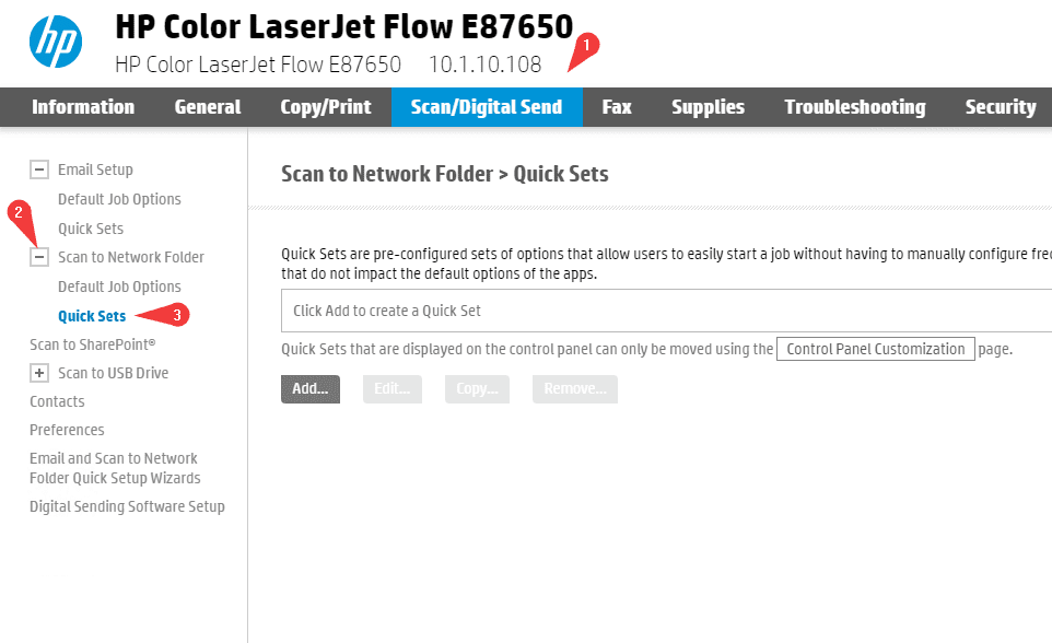 12. Click the “Scan/Digital Send” tab at the top and then, in the left column, expand the “Scan to Network Folder” option, and then click “Quick Sets”.