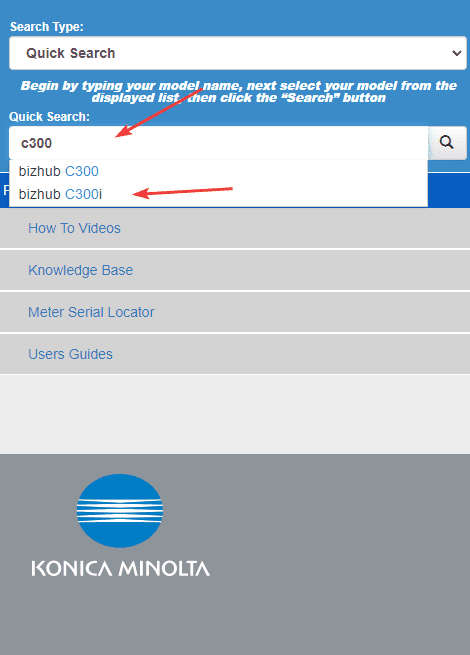2. On the left of the screen under “Quick Search” type the model of your printer and select it from the dropdown menu.