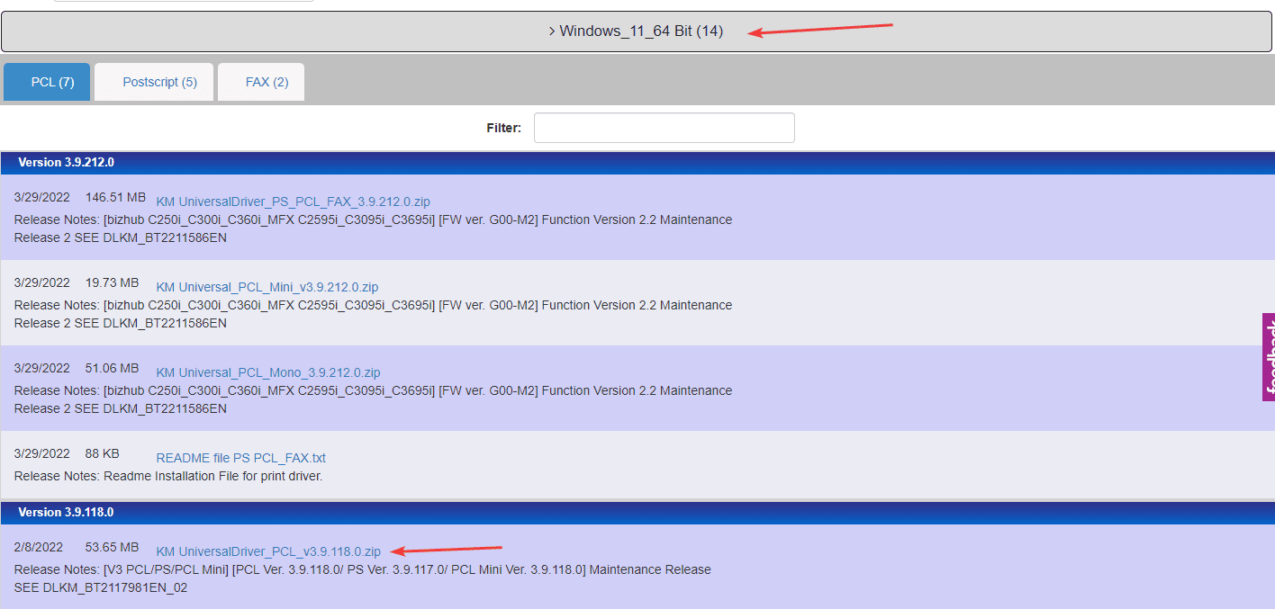 4. Expand the “Windows_11_64_Bit” section, find and download the “KM_UniversalDriver_PCL_v3.9.118.0.zip”.