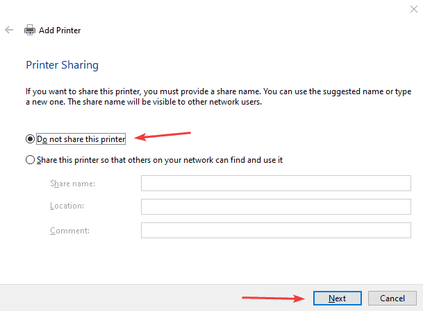 24. Click the “Do not share this printer” option and click “Next”. Notice that some versions of windows will not have this window. If you don’t, just move to the next step.