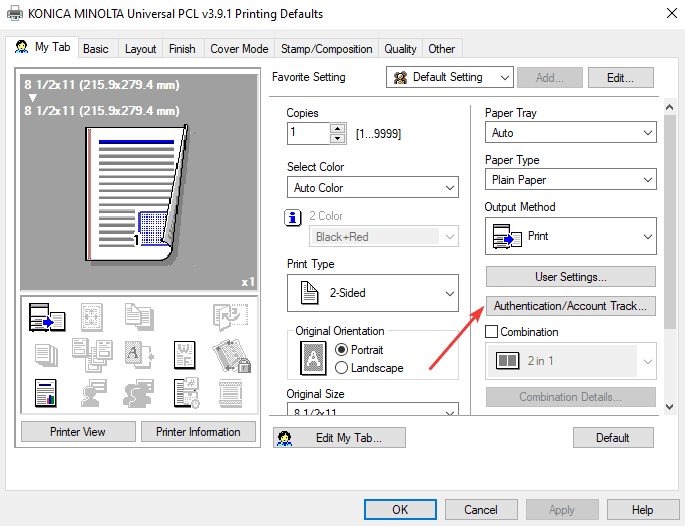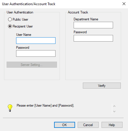 7. Input either your Username/Password under the “User Authentication” section or just your Password under the “Account Track” if you just use a pin to access the copier. Click “OK” once you are finished, then click “OK” on the next two windows.