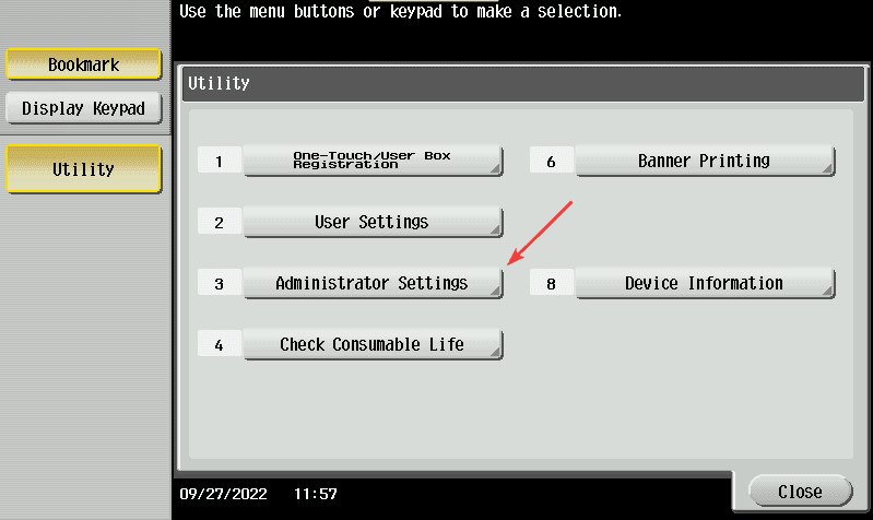 1. At the copier, press the “Home/Menu” button and then press the “Utility” option on the screen.