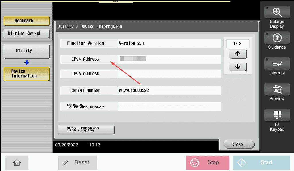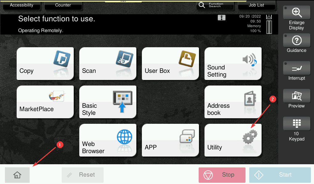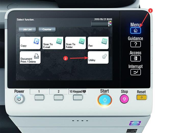 1. At the copier, press the “Menu/Home” button, then select the “Utility” option on the screen.